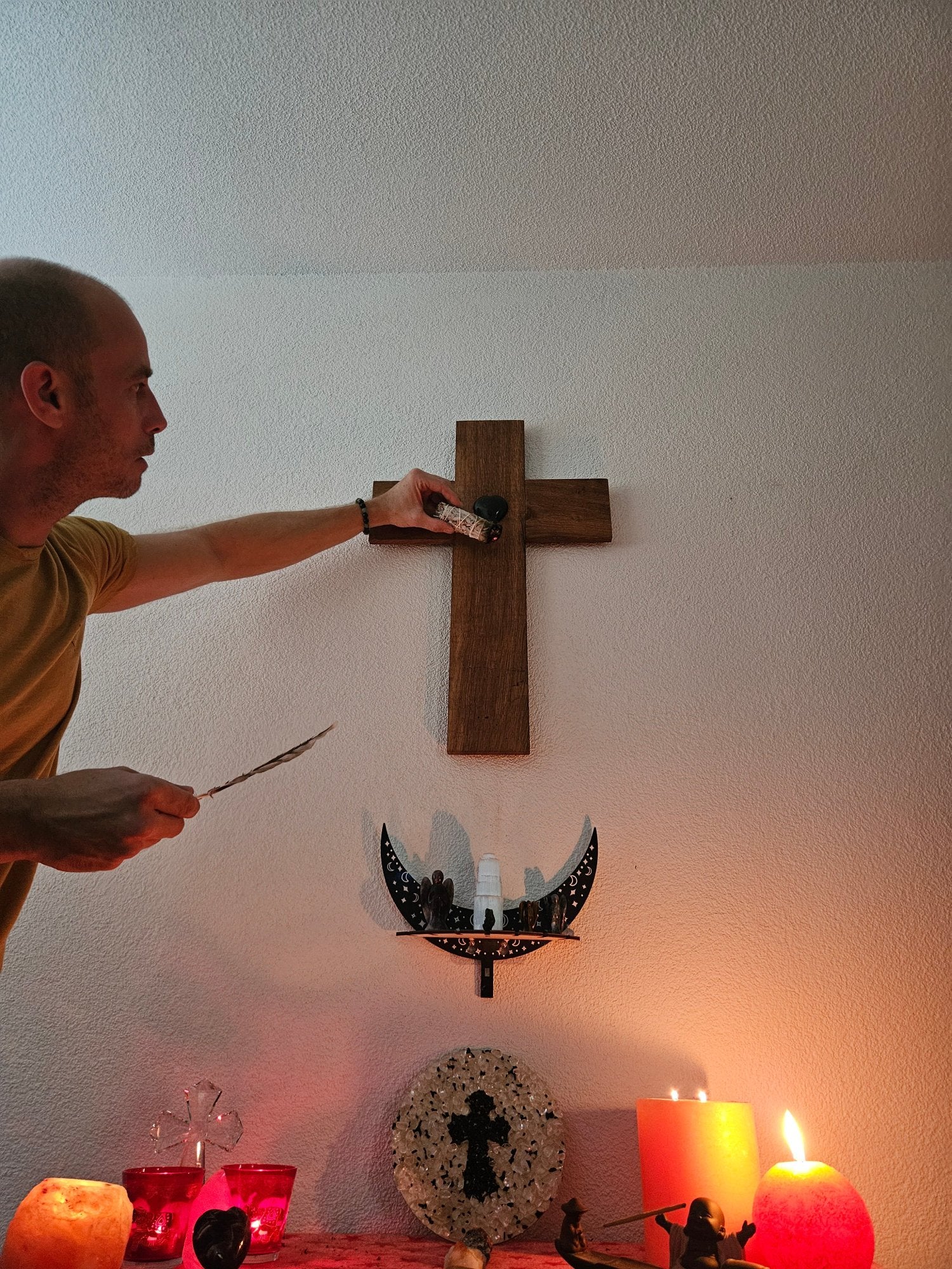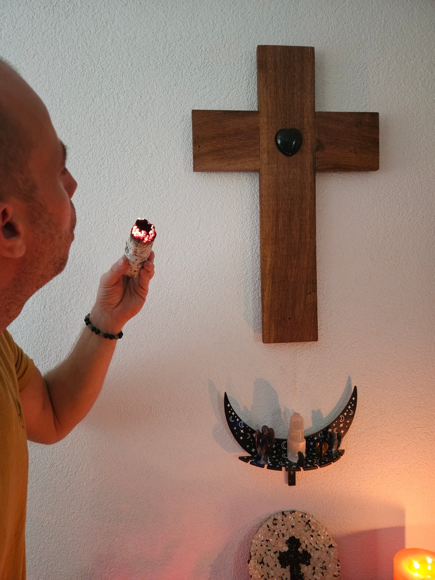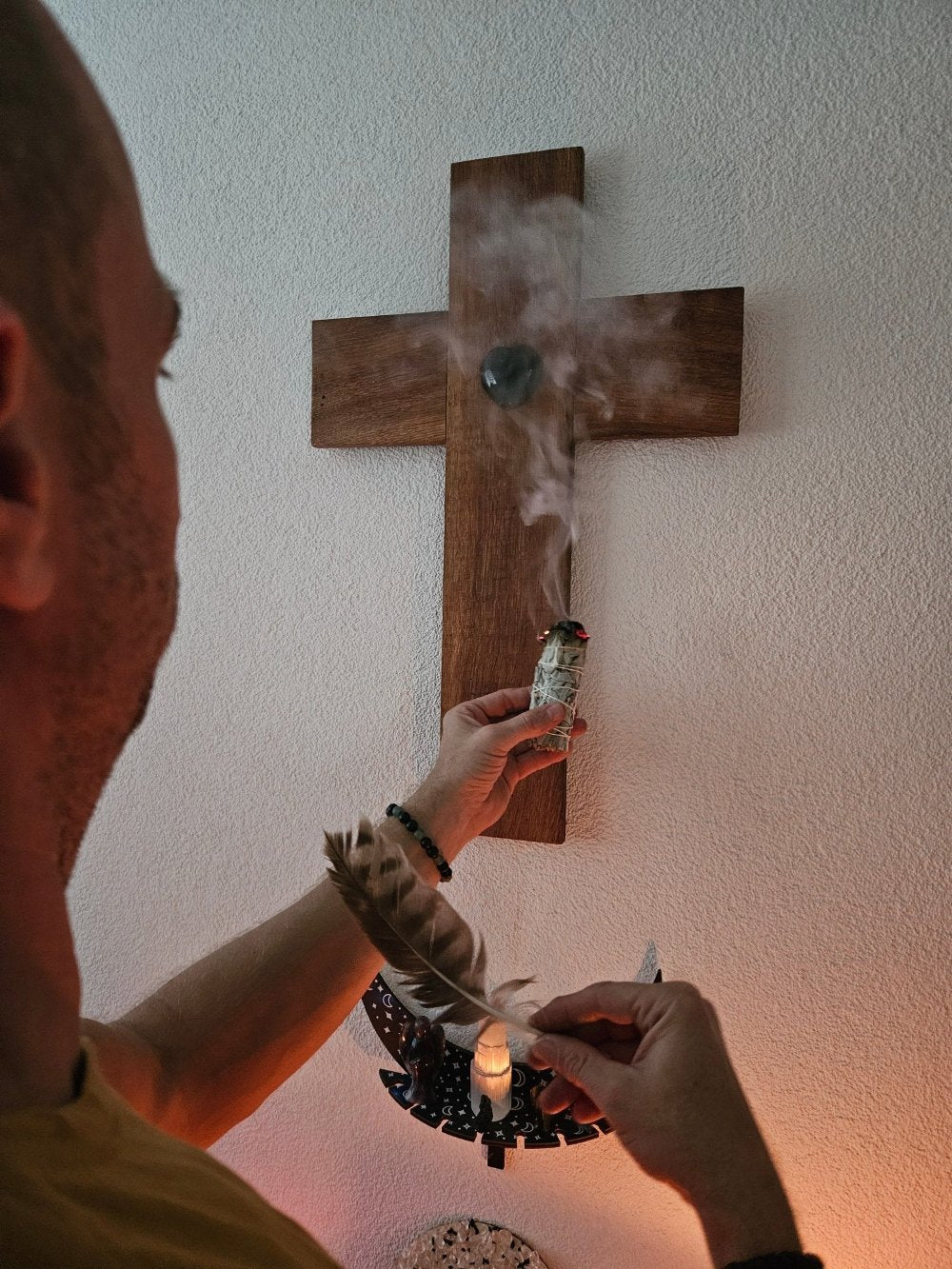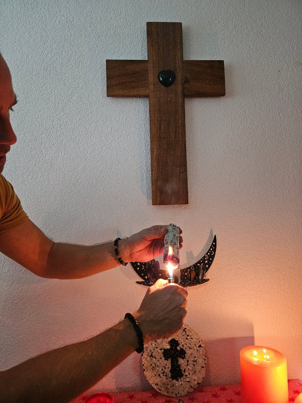 Es ist beeindruckend, wie der Rauch des weißen Salbeis Holz und Stein umhüllt und ihre Energien miteinander verschmelzen lässt. In diesem Moment scheinen Raum, Kreuz und Seele eins zu werden – ein Augenblick voller Schutz, Heilung und tiefer Verbundenheit. Diese Magie erinnert uns daran, dass das Spirituelle weit über das Sichtbare hinausreicht.